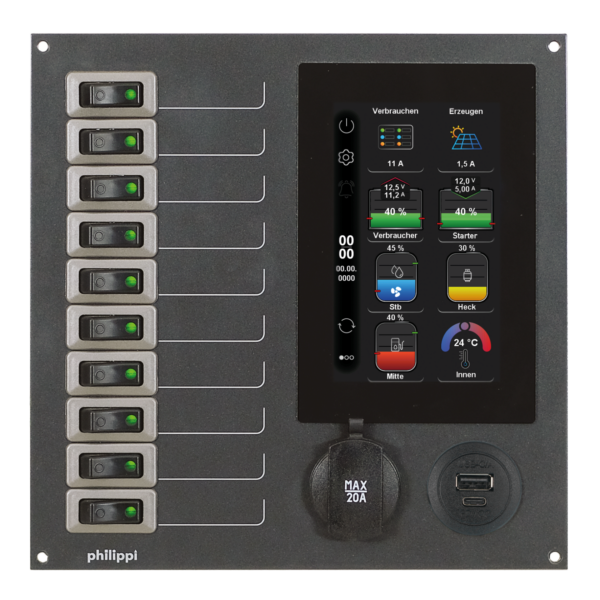 Schalttafel mit 10 Wippschaltern, System-Monitor sowie USB-C/A Doppelladesteckdose und DC Powersteckdose