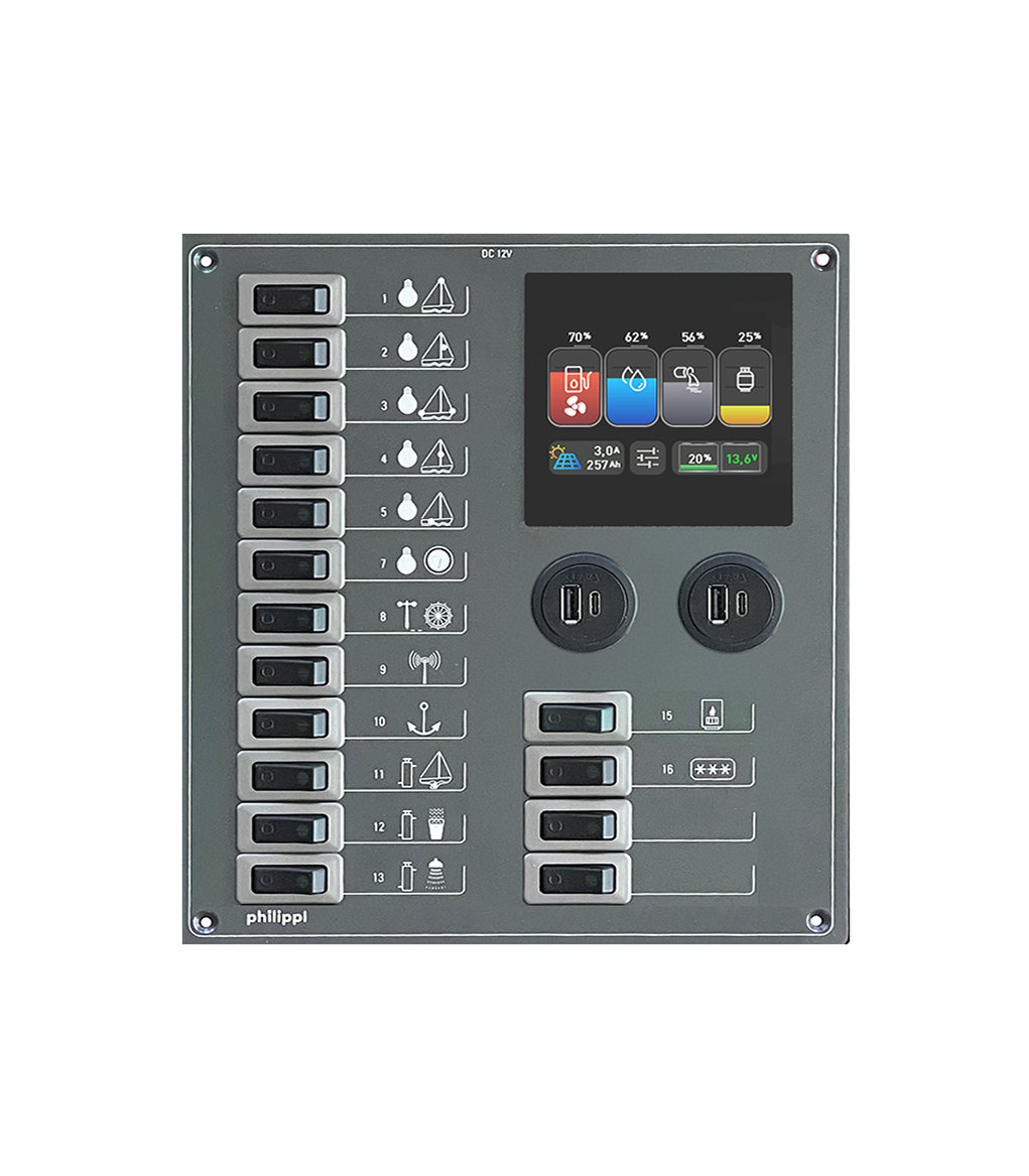 16 Stromkreise mit thermischen Wipp-Schutzschaltern, Monitor BTM 2 und zwei USB A/C Ladesteckdosen.